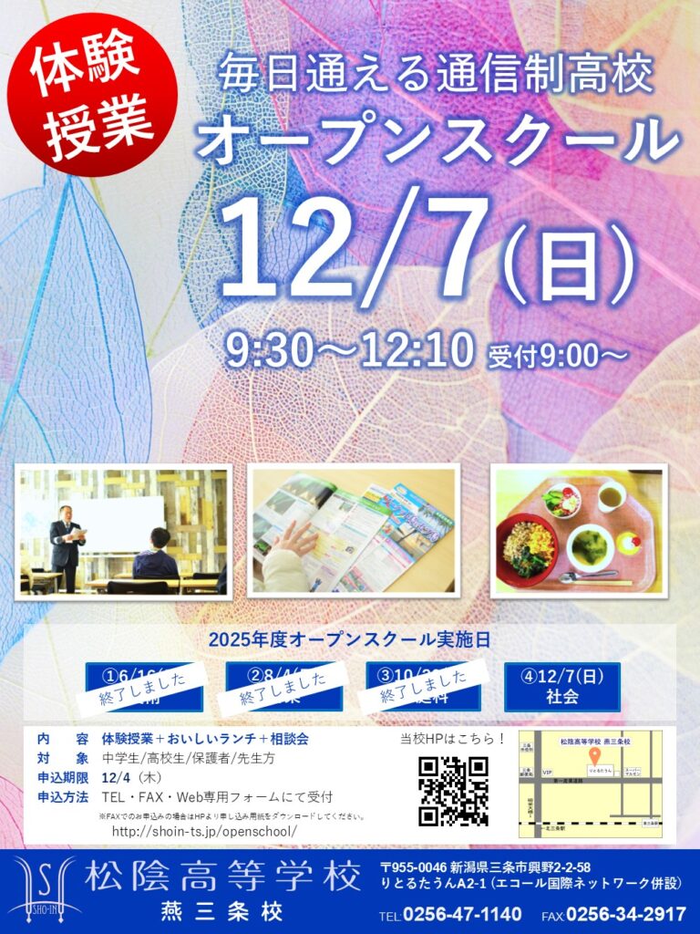 松陰高等学校燕三条校では、12/7(日)に、今年度最後のオープンスクールを開催します!